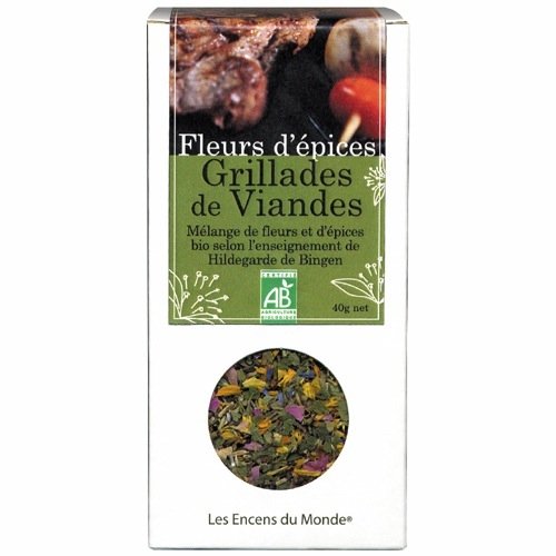 Epices Bio Griallades de Viandes Composition : FLEURS D'EPICES BIO GRILLADES DE VIANDES HILDEGARDE DE BINGEN Pour viandes rouges et blanches. Une touche magique pour donner à vos brochettes, grillades "planchas" et barbecues un goût savoureux et une présentation originale et raffinée. Ingrédients : Sel de l'Himalaya, ail*, paprika doux*, coriandre*, carvi*, rose*, bleuet*, turmeric*, poivre noir*, gingembre*, piment*, cumin*. * de culture biologique.Contenance : Boite de 85g net.Utilisations : Ajoutez à vos marinades à l'huile d'olives, saupoudrez sur les viandes avant cuisson et rajoutez une pincée sur vos viandes rôties avant de servir.