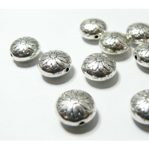 10 breloques perles plates fleur marguerite argentés ref 121